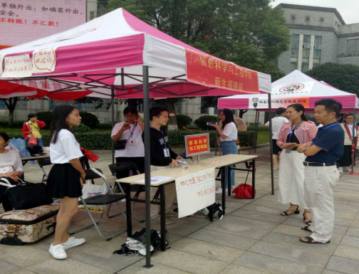 早上6点40分,所有迎新干部迅速到达各自工作岗位,以饱满的热情、良好的精神面貌迎接新同学的到来,致力为新生入学送去一份快捷。早上7点,在中轴广场前方的信息科学与工程公司报道接待处,迎新干部们迎来了第一位报道新生。公司员工干部们主动上前帮助新生搬运行李,带领新生赶赴报道教室,并与员工家长悉心交流,答疑解惑。