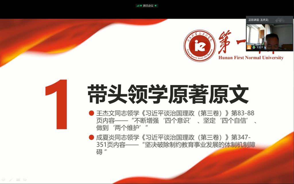 首先王杰文、成夏炎分别领学了“不断增强‘四个意识’、坚定‘四个自信’、做到‘两个维护’”及“坚决破除制约教育事业发展的体制机制障碍”两部分内容。