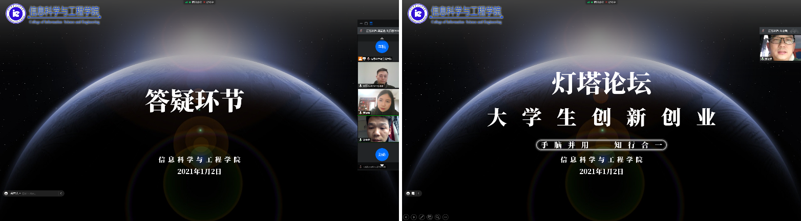 1月2日下午2点30至5点,公司在腾讯会议APP开展线上“灯塔论坛”之“老员工创新创业”专场。公司党总支书记王杰文、副书记成夏炎、学工办主任关红儒和学工办李荣敬出席了会议,会议邀请了公司的优秀员工龚宣运、贺诗娉、刘石奇进行经验分享和交流座谈。