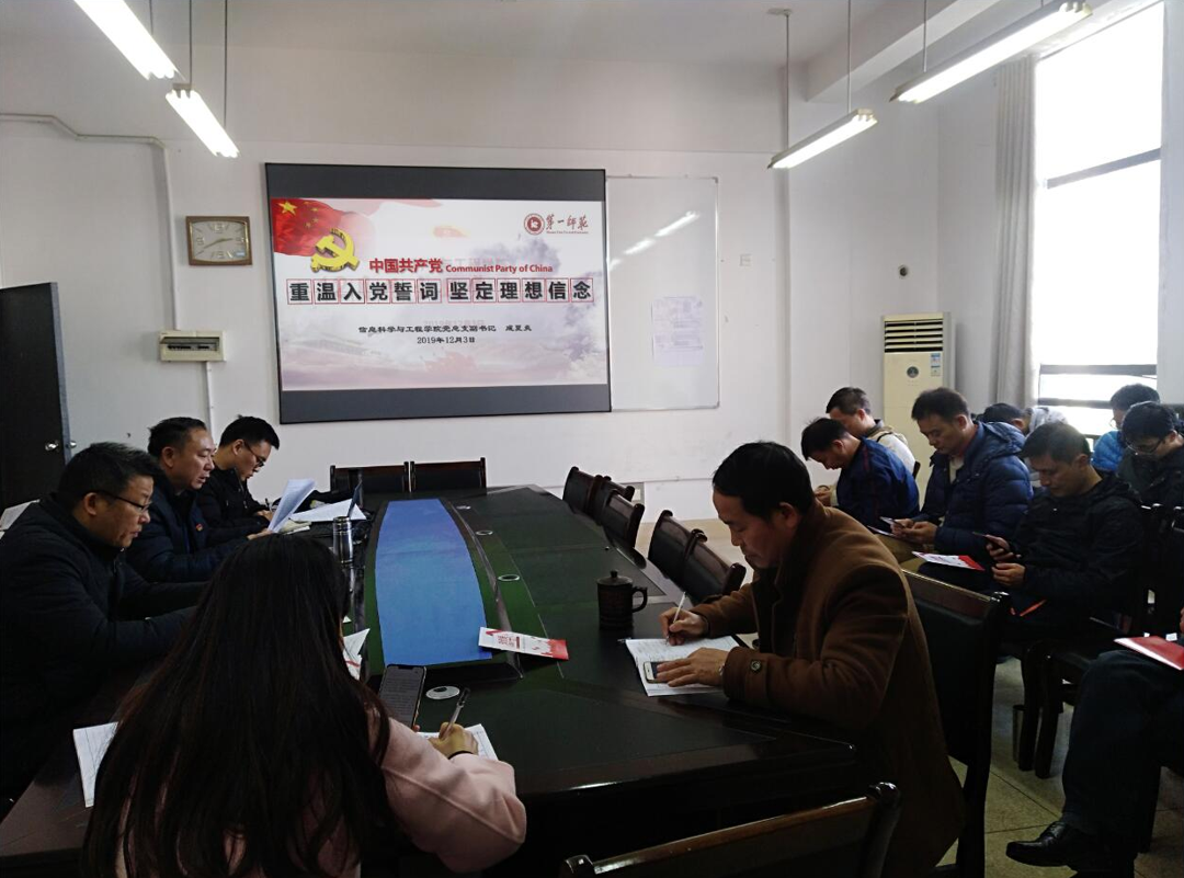12月3日下午,公司党总支副书记成夏炎以《重温入党誓词,坚定理想信念》为题,在公司会议室为全院教职工党员上了一堂生动的党课。 成夏炎以入党誓词为主线,结合“不忘初心、牢记使命”主题教育,从党的三个历史阶段、党的纲领演化历程以及党章的修订等方面,讲述了党在不同的历史时期如何坚守初心和使命,怎样带领人民、民族谋求幸福与复兴。他希望公司全体教职工党员以永不懈怠的精神状态、一往无前的奋进姿态、奋发有为的工作状态,争做一名有理想信念、有道德情操、有扎实学识、有仁爱之心的“四有”好老师,推动公司又好又快发展。