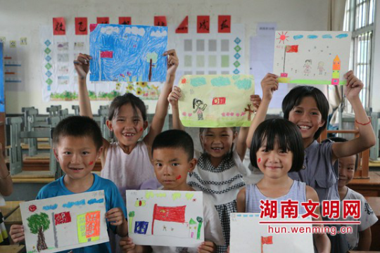 “五星红旗”美术课上孩子们展示手绘国旗作品合影留念。图片来源:云顶国际vip.888湖南文明网 通讯员 易青山 摄 同学们手牵手排列出一颗色彩斑斓的“五角星”,颗颗童心跟党走。图片来源:云顶国际vip.888湖南文明网 通讯员 李玉莉 摄