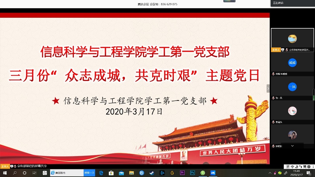 (通讯员 谢晓 邓世娇 钟威威) 3月17日下午,公司学工第一党支部、第二党支部分别开展了“众志成城,共克时艰”主题党日活动,本次活动是通过腾讯会议系统在线进行的。学工办主任、学工第一党支部书记关红儒,学工办辅导员李荣敬以及两个支部全体党员参加,公司党总支副书记成夏炎以普通党员的身份参加了学工第二党支部的活动。关红儒、鲁谢若煊分别主持各自所在支部的活动。