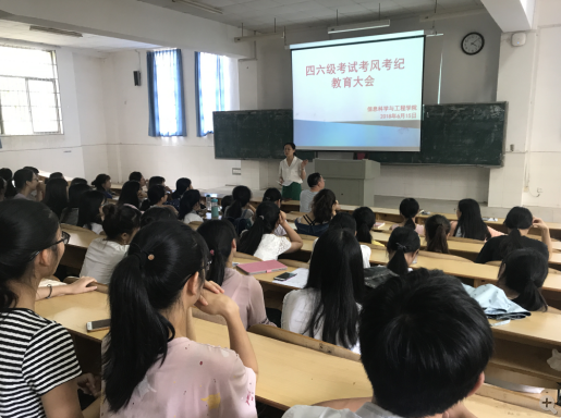 为严肃考风考纪,严明考试纪律,2018年6月15日下午16:00,信息科学与工程公司四六级考风考纪教育大会在实验楼C栋101教室隆重举行。公司党总支书记王杰文、党总支副书记易利、学工办老师关红儒、唐瑞鸿、院员工干部、各班班干部代表参加此次会议。会议由关红儒老师主持。