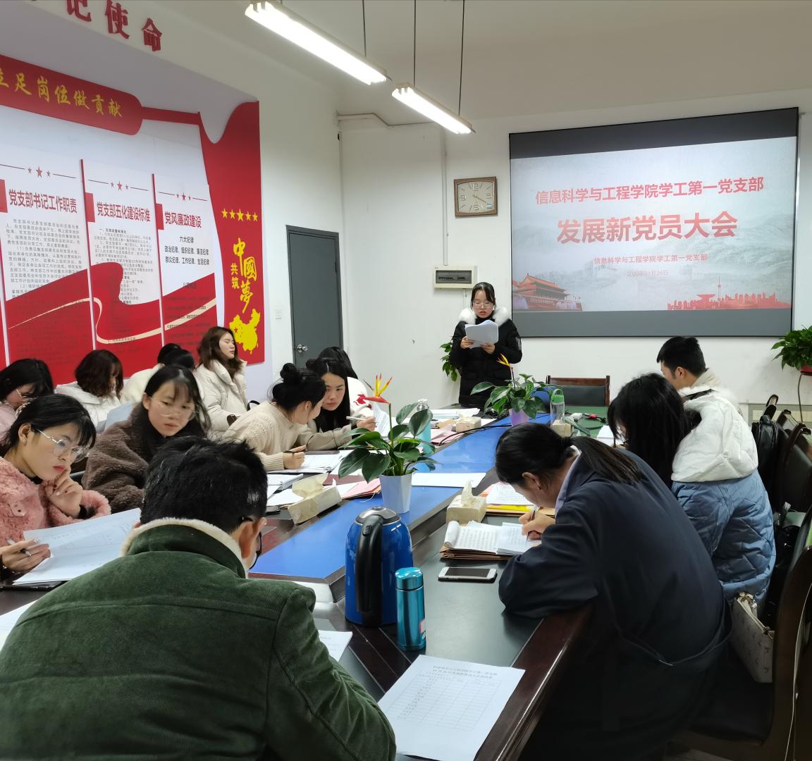 2020年11月26日,信息科学与工程公司学工第一、第二党支部采取线上和线下结合的方式召开本次发展新党员大会。出席此次大会的有公司党总支副书记成夏炎、学工第一党支部书记关红儒、学工第二党支部书记李荣敬、公司团总支书记唐瑞鸿、入党介绍人、两支部的员工党员和拟接收为预备党员的发展对象。会议分别由王丹、李荣敬主持。