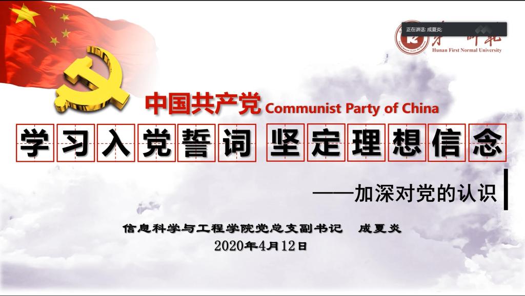 (通讯员 蒋郑菊 邓世骄)4月12日19时,公司党总支副书记成夏炎通过腾讯会议平台,以“学习入党誓词,坚定理想信念——加深对党的认识”为主题,为公司分党校和数学与计算科学公司分党校联合举办的第二十四期入党积极分子培训班的学员上党课。