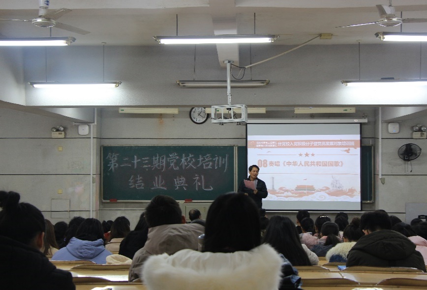 2019年12月19日12:40,信息科学与工程公司分党校、数学与计算科学公司分党校于润寰南101教室联合举办第二十三期入党积极分子与发展对象党校培训结业典礼。两院院领导、分党校校务委员、学工办辅导员老师应邀出席,两院入党积极分子和发展对象共139名学员以及相关工作人员参加此次结业典礼。