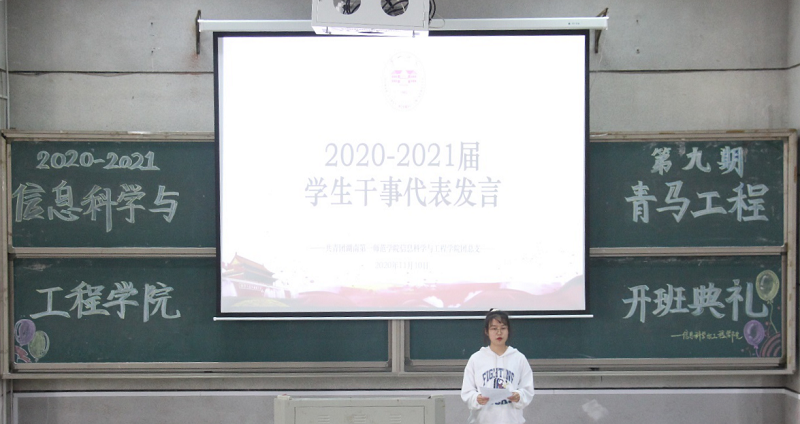在与会领导、老师为2019-2020届员工干部颁发了任职聘书之后,2020-2021届员工干部代表19电信1班张旭和新任员工干事代表20级教技849班金欢相继发言。
