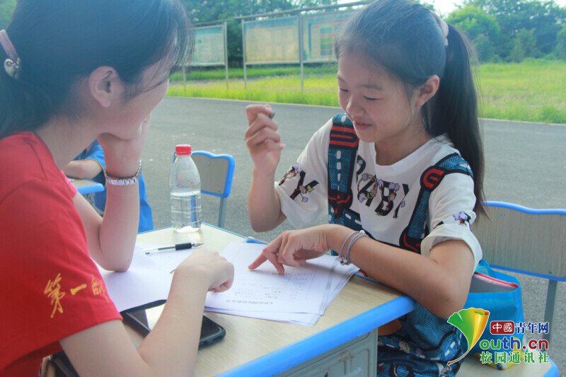 图为体育课上新航向·梦之队志愿者与“七彩假期”公益暑托班的孩子们分享课余生活。中国青年网通讯员 何星逸 摄