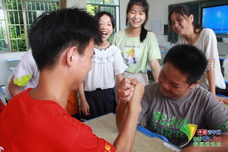 图为竹笋班班主任在开班仪式上与员工做游戏比赛掰手腕,双方都用了“全力”。中国青年网通讯员 欧阳健 摄