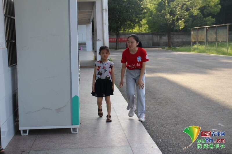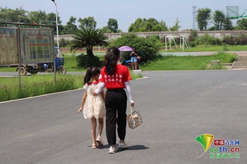 图为朝阳班班主任中午放学帮员工提书包,护送孩子。中国青年网通讯员 欧阳健 摄