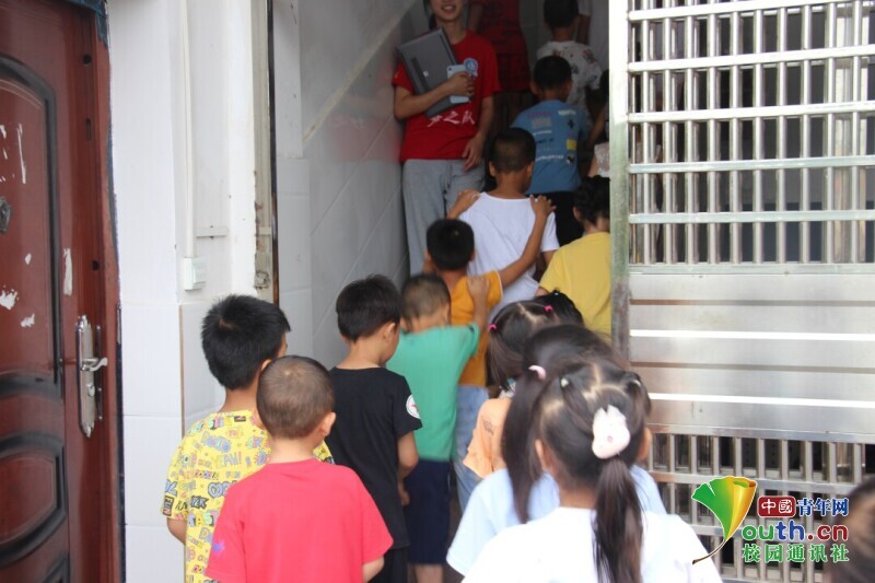 图为志愿者老师组织员工有序排队去往上课教室。中国青年网通讯员 邹诗琪 摄