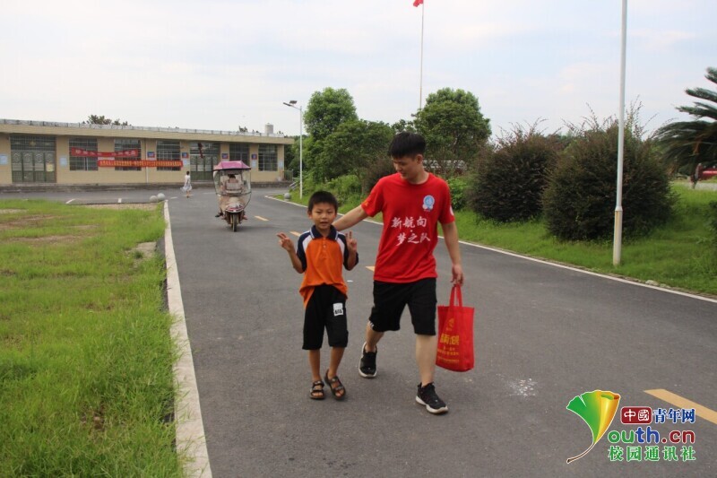 图为志愿者老师早上从校门口接孩子上学,帮忙提书包,询问有没有吃早餐。中国青年网通讯员 李惠婷 摄