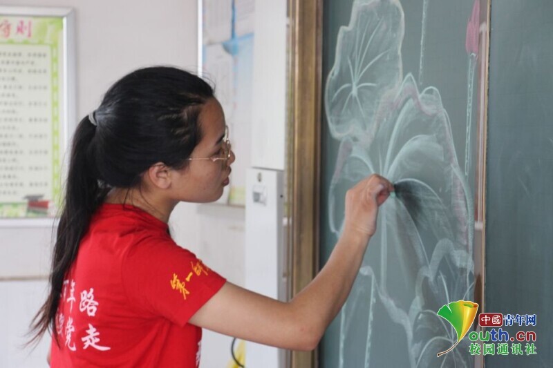 图为三下乡队员在教室为新生报到精心绘制黑板报。中国青年网通讯员 欧阳健 摄