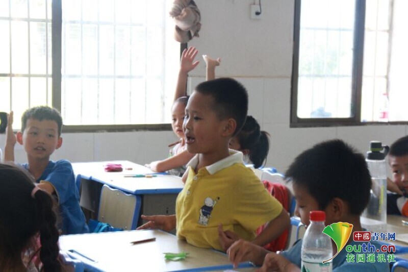 图为在老师问出谁愿意用自己的话重新来为大家讲述这个红色故事,小男孩在犹豫了一会儿之后勇敢地举起了手。中国青年网通讯员 段新利 摄