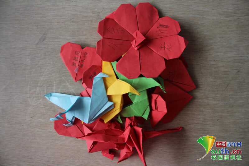 图为趣味手工课上,员工们在志愿者的带领下学会了折红心,员工们正开心的展示着自己的作品。中国青年网通讯员 欧阳健 摄
