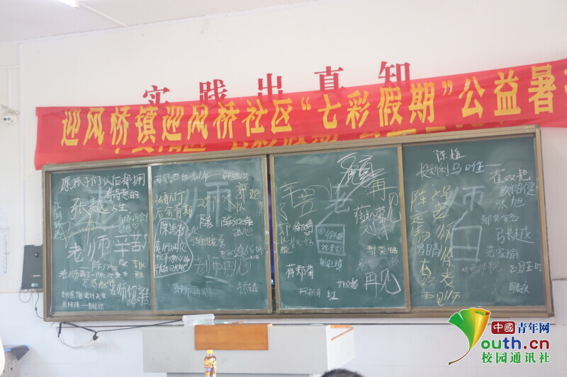 图为在最后一课主题班会上,孩子们与新航向·梦之队队员们在黑板上写的临别话语。中国青年网通讯员 段新利 摄