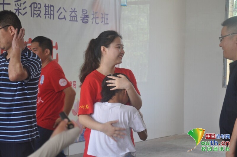 图为舞蹈兴趣班的孩子以拥抱作别自己的舞蹈老师。中国青年网通讯员 马唯一 摄