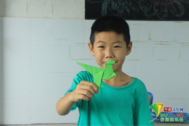 图为支教第七天的早上,提前到达教室的员工小林,给老师送上自己亲手折的恐龙。中国青年网通讯员 欧阳健 摄