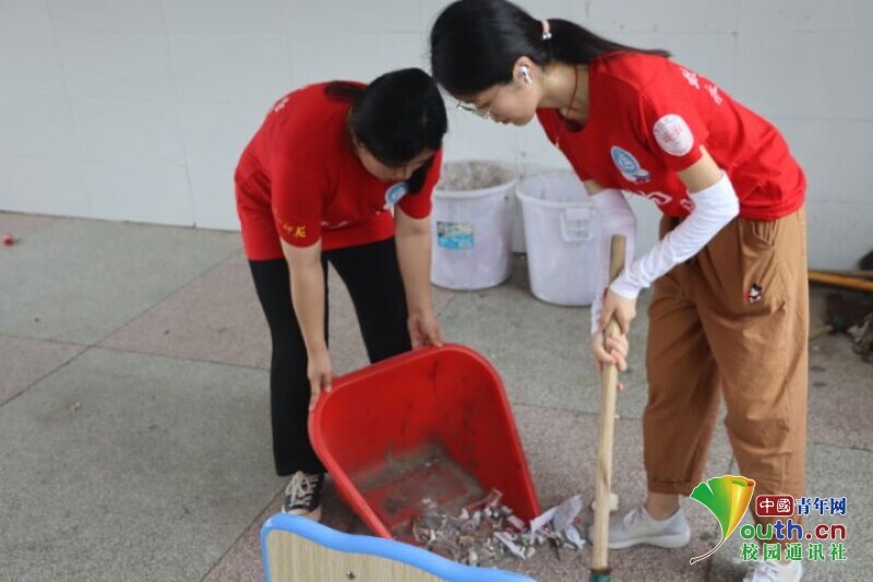 图为队员打扫教室卫生,清扫教室的杂物。中国青年网通讯员 欧阳健 摄