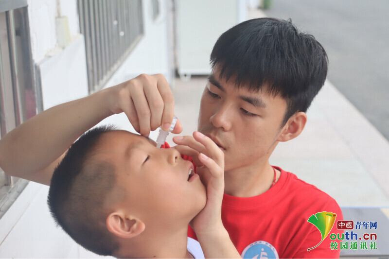 图为趣味英语课后,员工告知老师自己眼睛不舒服,志愿者老师耐心地询问原因,了解情况后,小心翼翼地为其滴眼药水。中国青年网通讯员 欧阳健 摄