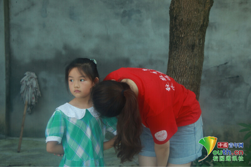 图为体育课上员工小爱的头发不小心松散,志愿者老师立马给扎起了双马尾,大汗淋漓。中国青年网通讯员 欧阳健 摄