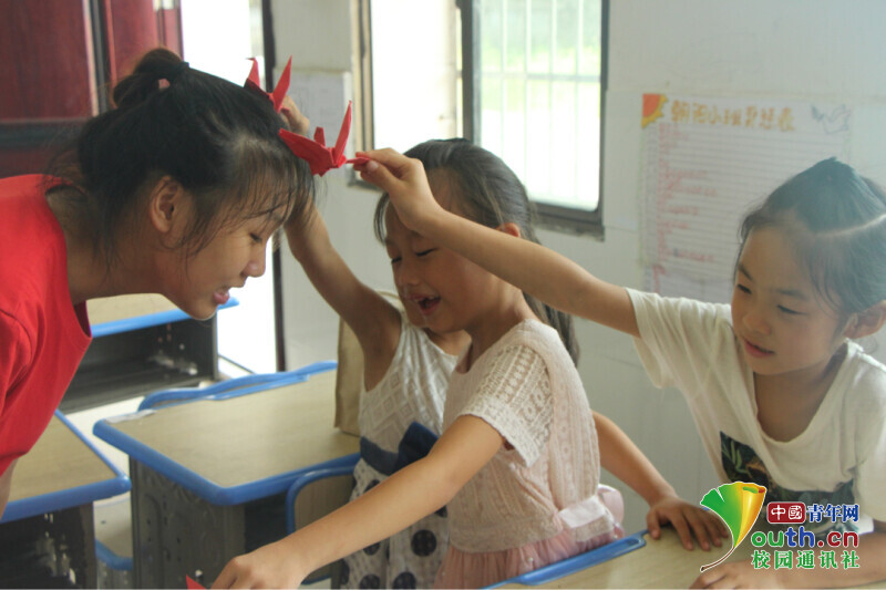 “老师您看我们的千纸鹤,可好看啦!”图为课间,员工害羞地叫来老师,向志愿者老师展示自己亲手做的千纸鹤,并且和志愿者老师玩起了游戏。中国青年网通讯员 马唯一 摄