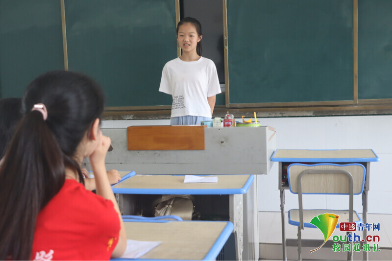 图为朗诵课上,志愿者老师鼓励班上同学积极竞选文艺汇演主持人,员工郭以璇勇敢地走上了讲台,大方地介绍自己。中国青年网通讯员 段新利 摄