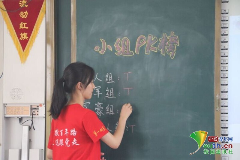 图为队员对小朋友们进行分组,让他们举手回答问题“PK”,激发小朋友们的学习兴趣。中国青年网通讯员 段新利 摄