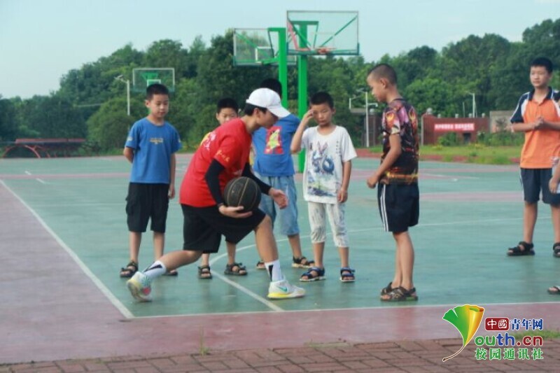 图为篮球兴趣班的孩子们围着“小老师”看他为大家亲身演示胯下运球的技巧。中国青年网通讯员 何星逸 摄