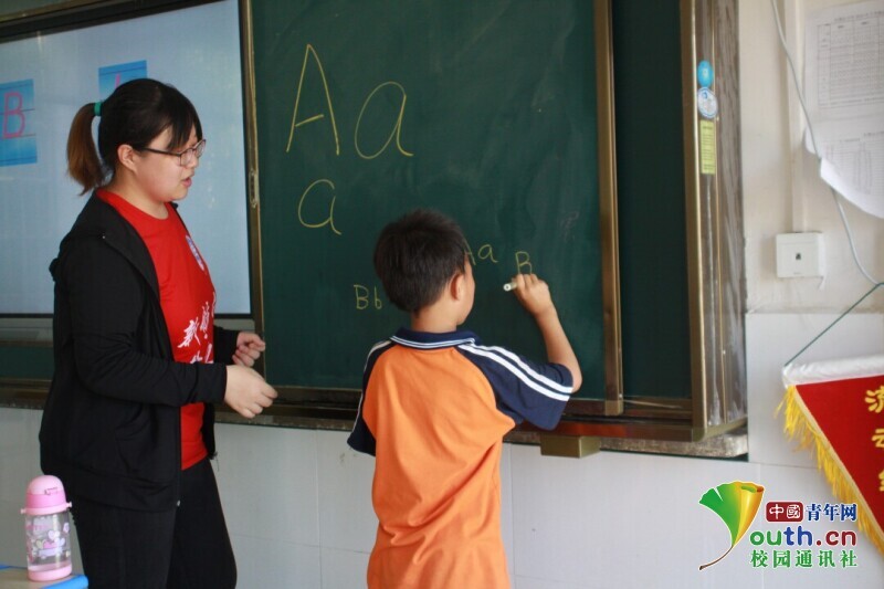 图为朝阳班员工在背写英语字母,这位小朋友受到老师表扬写的又快又好。中国青年网通讯员 欧阳健 摄